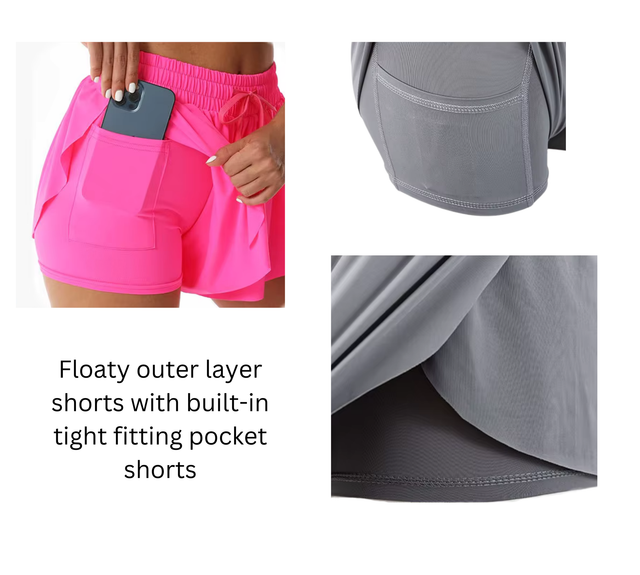 Super soft and comfortable stretchy tennis shorts, with a flowy outer layer and fitted inner layer for modesty.